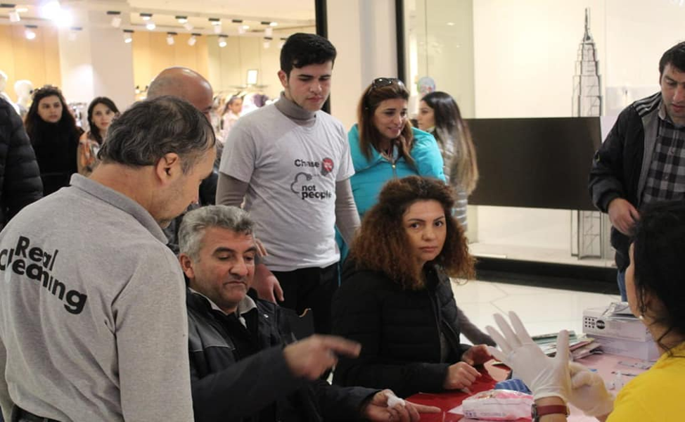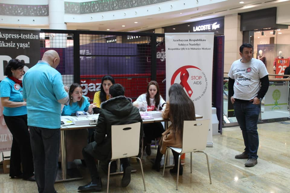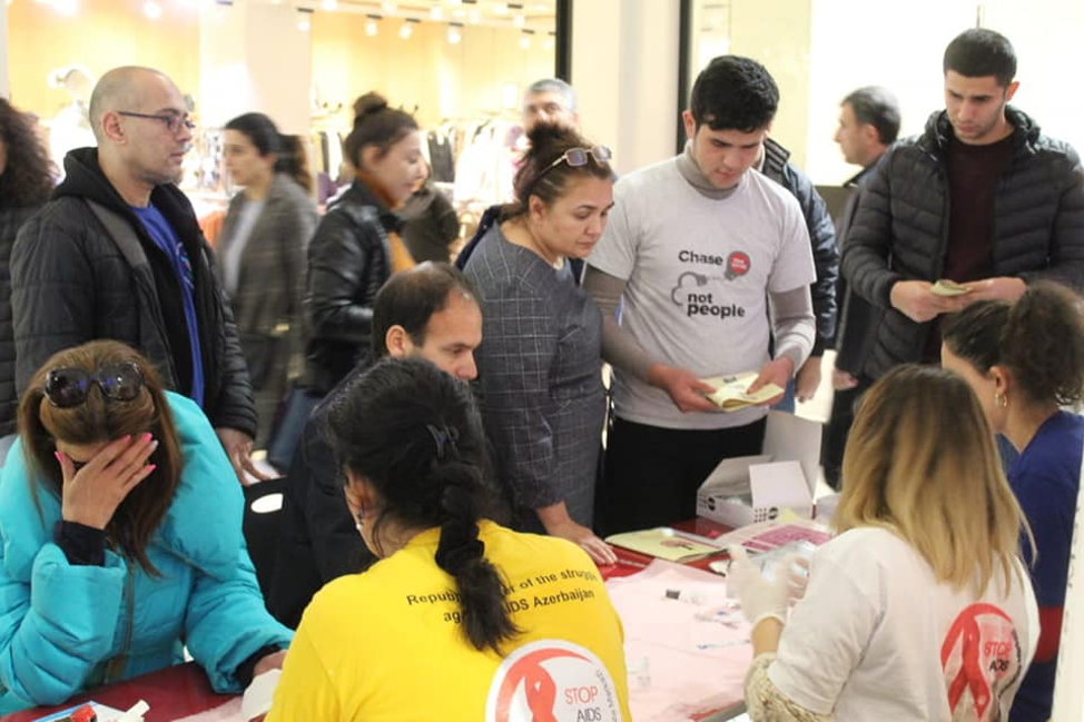 On December 1-4, 2019, in Baku, wide testing, awareness-raising activities were carried out as part of the campaign “Chase the virus, not people!”. The events were held at the University of Foreign Languages and in the central shopping centers of Baku: in the Metropark and Park Bulvar. People were informed about the tolerant attitude towards people with HIV, the problems of stigma and discrimination, and the problems faced by PLHIV. During the events, everyone could take their photo with the hashtag İNSANI YOX VİRUSU TƏQİB ET! (“Chase the virus, not people!”) and post it in social networks, thereby attracting public attention to the problem and contributing to the fight against stigma and discrimination against PLHIV. At the University of Foreign Languages, the organizers of the campaign held lectures on stigma and discrimination and the problems faced by PLHIV, on tolerant attitude towards people with HIV, in which 120 students and teachers took part. Leaflets on the topic of stigma and discrimination (900 pieces) were developed and translated into Azerbaijani, brochures on the theme “myths and reality about HIV” (900 pieces) were published, reflecting such issues as the legal and social protection of rights of people living with HIV. Materials were disseminated at the University, shopping centers, on the streets of the city, as well as during the volunteer blood donation campaign.